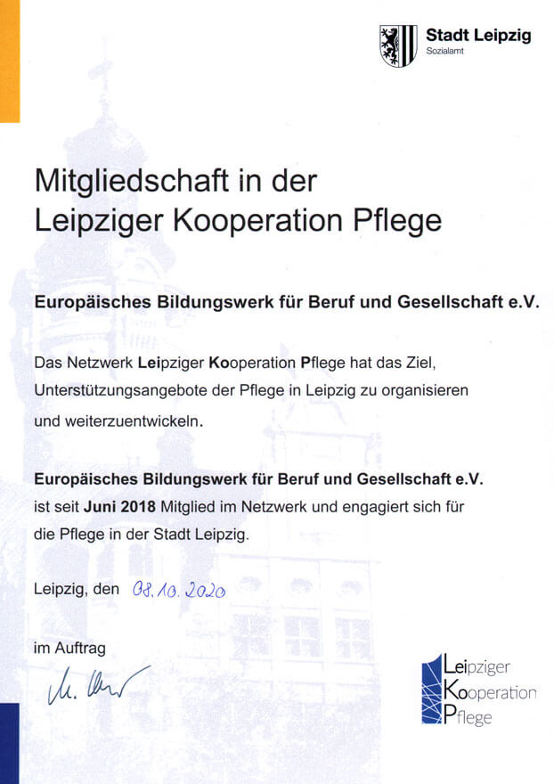 Zertifikat der Mitgliedschaft Leipziger Kooperation Pflege (LeiKoP)